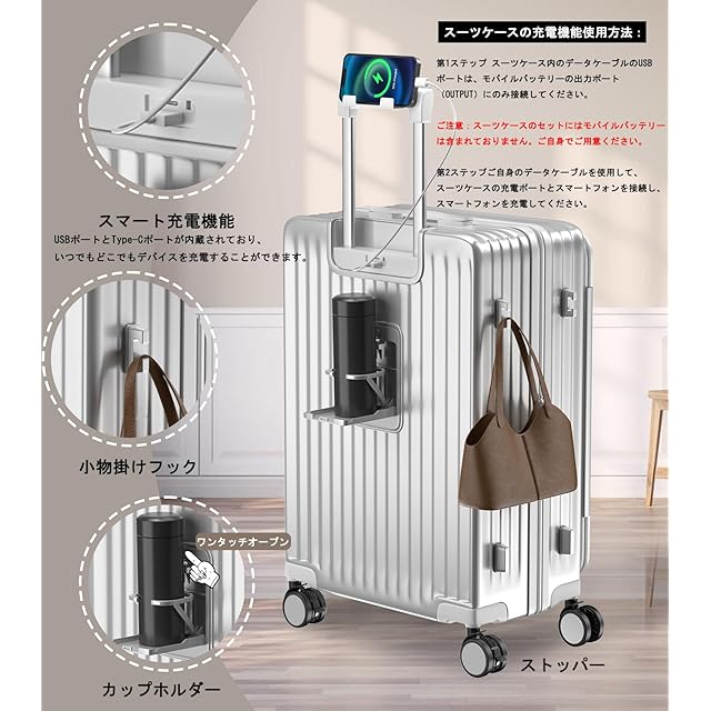 【多機能・キャスター ストッパー付き ・USB+Type C充電ポート付き ・カップホルダーとスマホルダーを付く】走行中の揺れる電車内でもストッパー(ブレーキ)機能でピタっと自立。乗降時や座席の離着席時などではすぐにストッパー解除ができるのでスムーズに移動を再開することができます。スーツケースにモバイルバッテリーを収納するポケットがついており、 USB+Type Cポートの充電口が外にあることで、いつでもどこでも充電できます。便利な折りたたみ式ドリンクホルダー付き。バックカップホルダー、ミルクティーカップ、傘いつでも配置でき、旅行をより便利にすることができます。レバーの上部にはスマホルダーが付いているので、フライトの待ち時間に両手が自由になり、外出先でもリラックスできます。