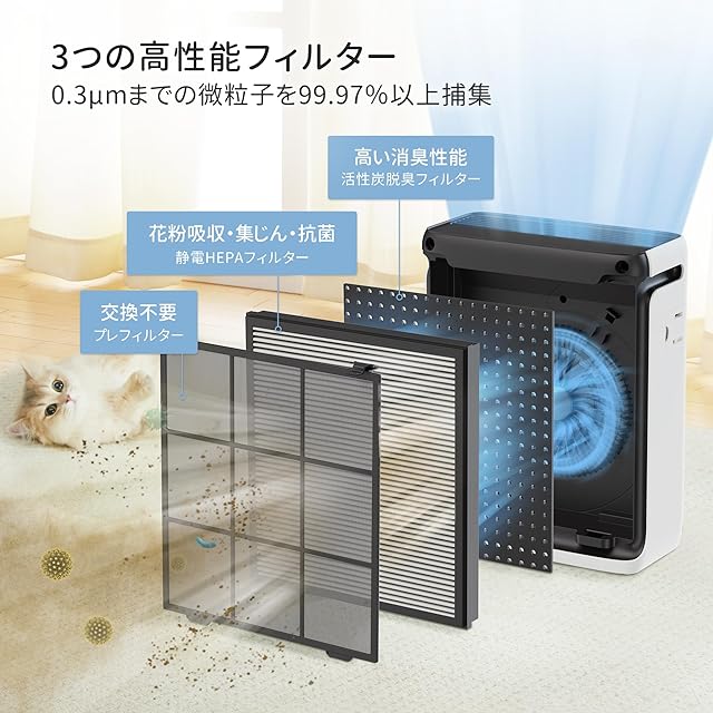 【買い換え不要プレフィルター、お手入れ簡単】①プレフィルターは水洗いにより性能が再生なので、繰り返し気持ちよくお使いいただけます。②オリジナル交換用フィルターの購入用検索キーワード:B0BRN18FLWです。(該当型番の脱臭効果をより強化するため、ニオイに対しての吸収率のよりアップされたフィルターの導入を推進中です。) 試験機関:(株)電通サイエンスジャム JEM 1467-2015の試験により、フィルターの寿命は2年です。推薦のフィルター交換目安は6~12ヶ月です。③フィルターチェックのマークが点灯した場合、フィルターを掃除してください。フィルターを掃除して再び本体に取り付けても引き続き点灯した場合、フィルターの交換が必要です。注意:フィルターを掃除や交換の後は必ず「フィルターチェック」ボタンを3秒間押してください。フィルターが正常にセットされると、ランプは消えます。消えない場合、フィルターの交換が必要です。