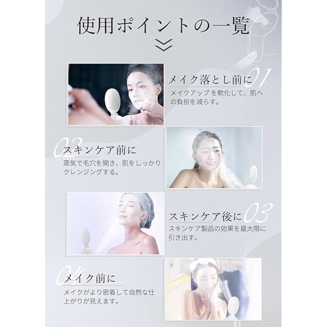 【微粒化技術/ワイド濃密スチーム】ナノは1mmの10億分の1の細かい粒子。普通のスチームと比べて格段にキメが細かいので肌への浸透力も高い!瞬時にナノ化された水分子がお肌の奥にまで届く、毛穴を開くことで詰まった角栓や汚れを落とし、洗浄効果を高め基礎化粧品の浸透率をアップさせてくれる美顔スチーマーです。