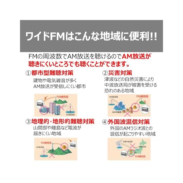 AM放送が入りにくいところや災害時にFM周波数を用いたAM番組も聞くことができる『ワイドFM』に対応。