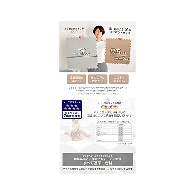 ・床暖房の種類等によって、商品に多少の反りが生じる場合がございます。 ・重量物を載せますと、マットが凹み変形する恐れがあります。 ・PE素材の特性上、使用するうちに負荷がかかる部分に多少のへたりが生じる場合がございます。 そのため、既に使用しているマットに新しいマットを繋げて使用する際、上手く繋がらない場合もございます。 ・床材(塩化ビニル・フローリング等)によって、色移りや変色が起こる場合がございます。床とマットの間に敷物や防護シートを敷いていただくことを推奨しております。 ※類似品が出回っております。本製品はシリーズ累計110万セットを突破。ホルムアルデヒドの検査や耐熱検査をし、品質にこだわった商品です。品質や販売実績は真似できません。商標登録済み ※2019年1月10日に素材をEVAからPEに変更しました。