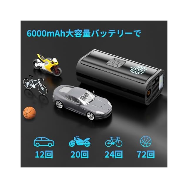 電動空気入れ 車【10秒充填 自動停止】充電式 コードレス バイク 空気入れ 電動 空気圧指定可 最大圧力150PSI 多機能電動空気入れ 6000mAh Type-c出力ポート急速充電 自動車/自転車/ボール/浮き輪/バイク対応 SOS/LED懐中ライト付き日本語説明書付き
