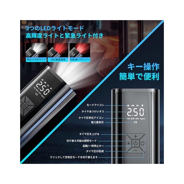 【LCDデジタル表示&4つの気圧単位】この電動エアーポンプは、大きな液晶画面バッテリー残量、4つのインフレモード、実際空気圧、指定空気圧の値がはっきり表示されます。夜でも数字が見やすく、安全に空気入れが可能です。単位はBAR・kg/cm²・KPA・PSIの4種類に切り替え可能です。ワンタッチで簡単に使用できるので、初心者の方でも心配ナシ。