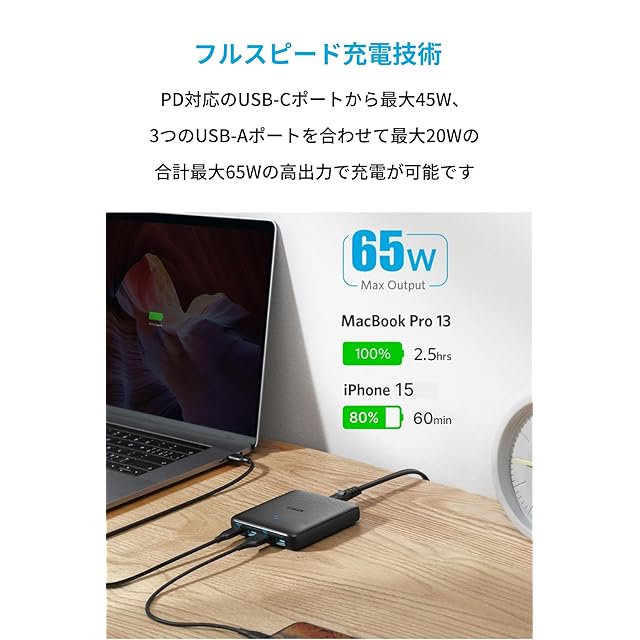 幅広い対応機種:Apple製品、タブレット端末、ノートPCなどのUSB-C対応機器にも対応。合計最大65Wの高出力で、多種多様な機器に急速充電が可能です。