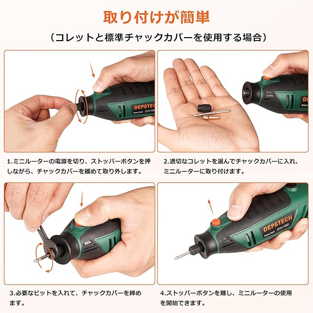 【6段階可変速&強力な180Wモーター】DEPSTECHのプロフェッショナルなミニルーターは、10,000から40,000RPMまでの6段階の調節が可能です。木材、ガラス、金属、プラスチック、翡翠など、様々な素材に微妙な彫刻をする際に、ロータリーツールの速度を簡単に制御できます。強力な180Wの純銅モーターは、作業効率を30%向上させます。