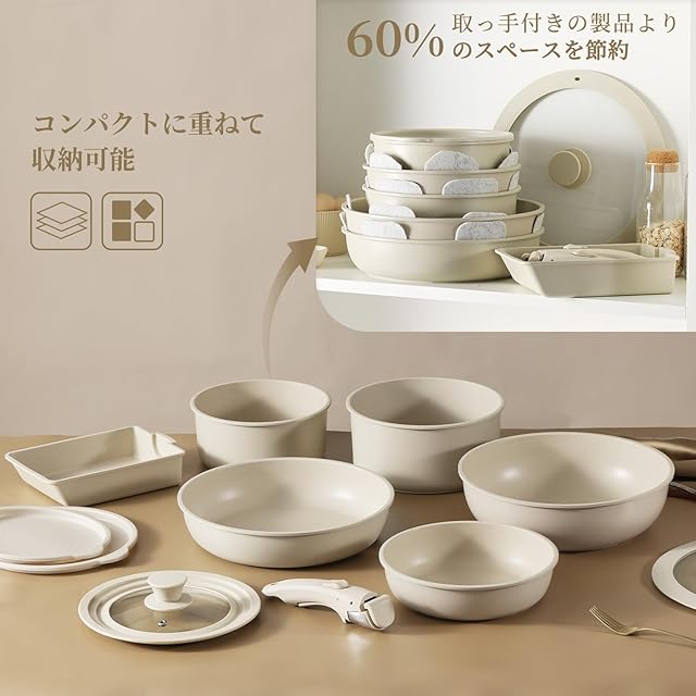 CAROTE カローテ フライパン セット 16点 IH対応 PFOA PFOS フリー 取っ手のとれる マーブルコート こびりつきにくい 手入れ簡単 一年保証 グレージュ COSY高級シリーズ