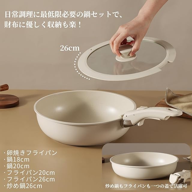 【セット内容】鍋18cm/0.43kg、鍋20cm/0.55kg、卵焼きフライパン0.39kg、フライパン 20cm/0.39kg、フライパン26cm/0.57kg、炒め鍋26cm/0.62kg、16・18・20cm兼用ガラス蓋、ガラス蓋26cm、専用取っ手×2本、シール蓋18・20cm、収納用マット*4枚、梱包重量(約): 4.9kg