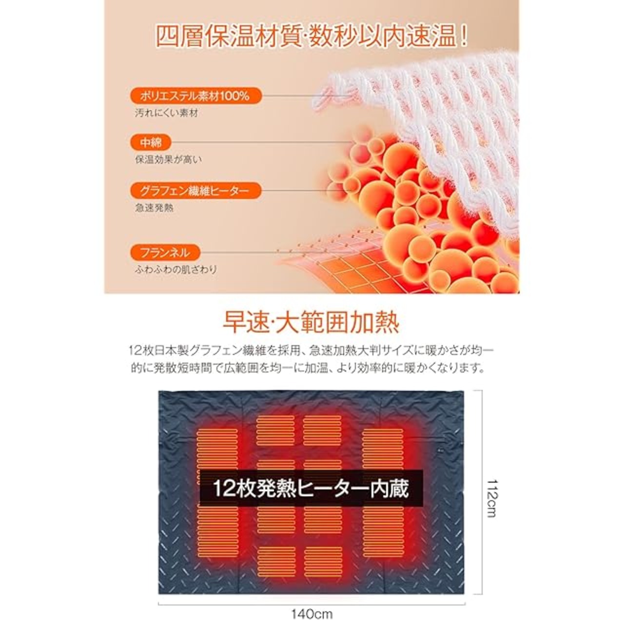 【2024年冬新型の電気毛布・12枚ヒーターかつ65℃・快適な睡眠サポート】 極暖・速暖タイプの敷物兼用電気毛布です!12枚のヒーターを内蔵し、USB電源に接続すると、すぐに体が温まる電気毛布 ひざ掛けです!特に寒い冬の夜、電気毛布 大きいサイズは快眠を促し、睡眠の質を高めてくれます。12箇所の発熱エリアがあり、体のどの部分が冷えていても簡単に温まります。このコストパフォーマンスの高い電気毛布 電気ブランケットのおかげで、冬の寒さも平気です。また、アレルギーのある人には、ベッドの湿気やダニを駆除する効果もあるので、健康にも良いでしょう。この掛け敷きは快適な睡眠と箇性的な温度制御を追求するあなたの理想的な選択です。