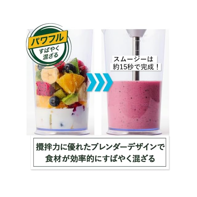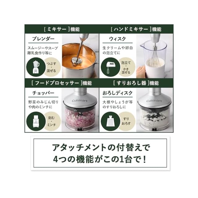 アタッチメントを替えるだけで、「つぶす」「混ぜる」「泡立てる」「かき混ぜる」「刻む・ミンチ」「おろす」が全部できる!