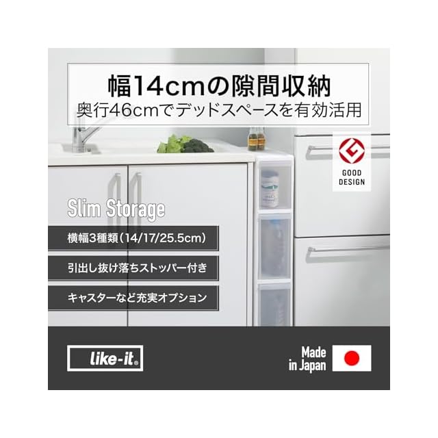 ライクイット ( like-it ) キッチン収納 すき間 引出し スーパースリム 3段 約幅14x奥46.5x高82cm オールホワイト 日本製 FTS-111L 隠す収納 幅14㎝ デッドスペース収納 すき間を活用