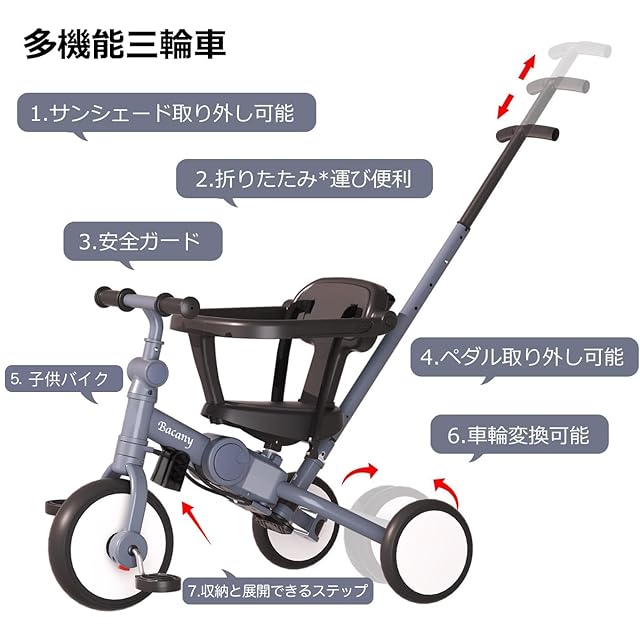 Bacany 子供用三輪車 7in1 三輪車 ステップ付き 折りたたみ 手押し棒 おしゃれ 1歳-6歳 コンパクト 自転車 おもちゃ 乗用玩具 幼児用 キッズバイク プレゼント おもちゃ 調整可能 お祝い ギフト シートベルト付き (グレー)