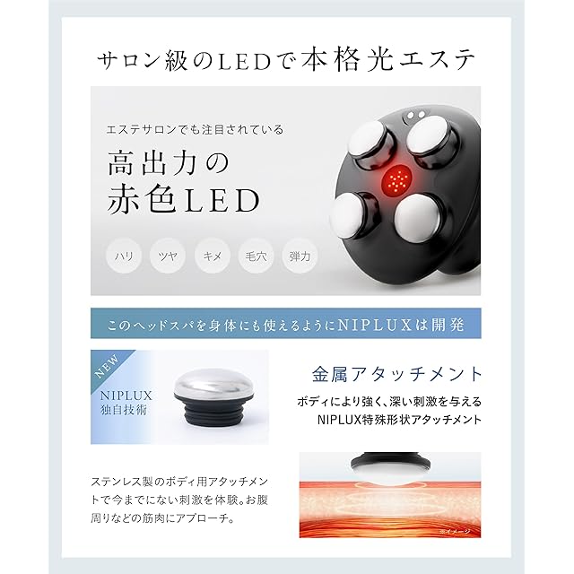 【サロン級のLEDで本格光エステ】エステサロンでも注目されている高出力の赤色LED、約630nmの波長を採用し、従来品と比べ輝度をより広範囲に届けます。LED光を12個に改善し、照射範囲を広くし、NIPLUX独自の構造を採用します。お肌の広範囲に満遍なくLED光を届けることで、頭皮から全身の本格ケアを叶えます。
