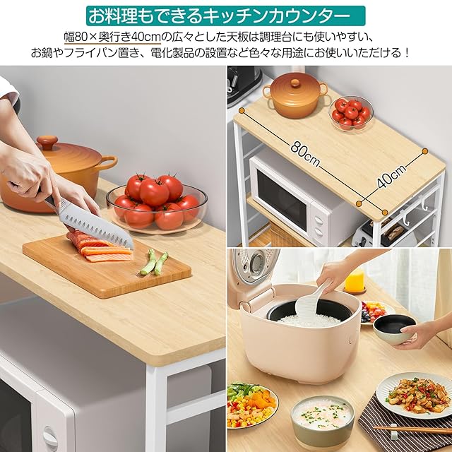 【お料理もできるキッチンカウンター】キッチンに作業スペースや収納をプラスしたい方におすすめのキッチンカウンター。幅80×奥行き40cmの広々とした天板は調理や盛り付けに便利な作業台として使えます。ちょっとした調理や料理を置くスペースに。キッチン家電・食器類・キッチン用品をまとめて収納できますので、キッチンスペースを最大限に有効活用できます。一人暮らしのお方に大おすすめのキッチンラックです。ゴミ箱やワゴンを置ける棚下スペース、デットスペースの有効利用、無駄のない空間活用で充実のキッチンライフへ。