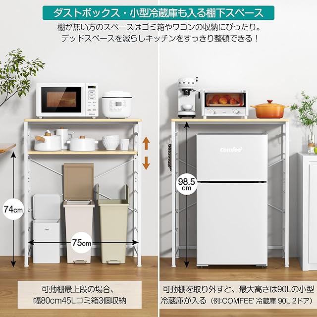 【ゴミ箱上ラック】横幅約80cmあり、第2段の棚板を最上段に設置すると、棚から床の高さは74cmであり、最大3個45Lのダストボックスが置けます。第2枚の可動棚を取り外すと、最大高さ98.5cm以下の小型冷蔵庫を対応できます。ゴミ箱上のデットスペースを、作業台・収納として有効に活用。お鍋やフライパン置き、電化製品の設置など色々な用途にお使いいただける!