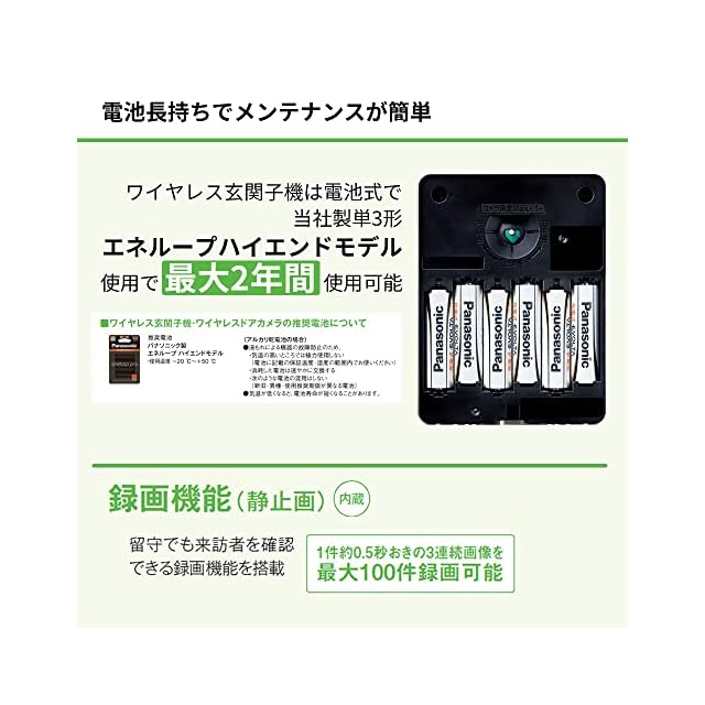 【特徴】配線工事不要で取付簡単なワイヤレステレビドアホンです。ワイヤレス玄関子機の電池持続時間が約2倍にアップ(VL-SGD10L(2016年製)との比較)し、(パナソニック製充電式エネループハイエンドモデル6本の使用で)最大2年間使用可能になりました。留守中の来訪者画像をワイヤレスモニター親機に1件あたり3枚の連続画像(約0.5秒おき)で最大100件まで録画可能できる「自動録画機能」を搭載しています。帰宅後、モニター画面で確認できるので便利です。保証期間は1年間です。