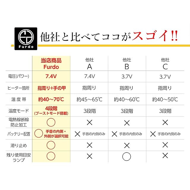 ■【Furdoインナーヒーターグローブ】当社のヒーター商品シリーズの「Furdo(フルドゥ)」は、大分県(おんせん県)で企画し、「温泉のような心地よい温かさを提供すること」をコンセプトとしています。■【安心】安心して商品を使用していただけるように、本体・付属品の検品・チェックなど大分県の工場で行っております。■【7.4Vハイパワーで温かい】従来品では3.7Vのところを、7.4Vのバッテリーを使用。速暖性にも優れ、約10秒で温かさを感じられるように設計しています。