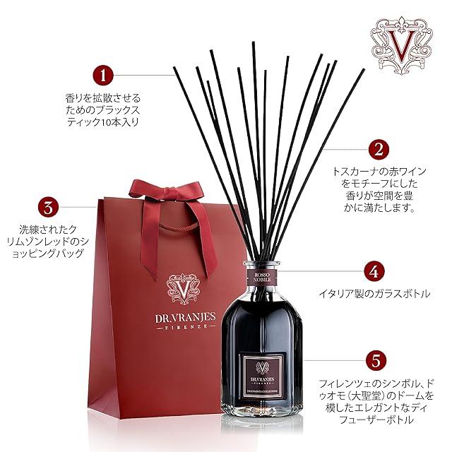 【直営】DR. VRANJES –ドットール・ヴラニエス ディフューザー ROSSO NOBILE〈ロッソ ノービレ〉250ml ルームフレグランス リードディフューザー エレガントなオリジナルショッピングバッグ付き メイドインイタリア モチーフは赤ワイン フルーティノート リッチでダークなフレグランスカラー