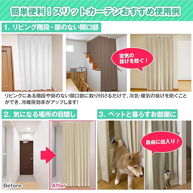 [カーテンくれない] 高断熱 間仕切り「スリットカーテン」リビング階段や玄関 レールセット 目隠しカーテン アコーディオンカーテン 突っ張り棒 色:エクリュ サイズ:(幅)80cm×(丈)230cm
