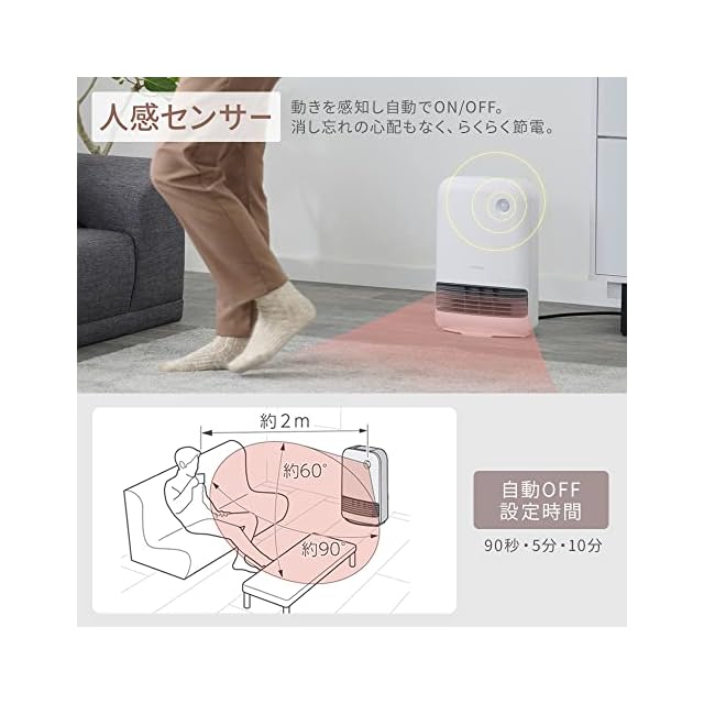 ◆3つの安全装置。転倒時安全装置:傾いたとき・転倒したときには、傾きセンサーが検知して運転を停止します。切り忘れ防止機能:運転時間が3時間を経過すると、運転を停止して電源が切れます。チャイルドロック:子どものいたずらによる事故などを防ぐためにチャイルドロックをかけることができます。