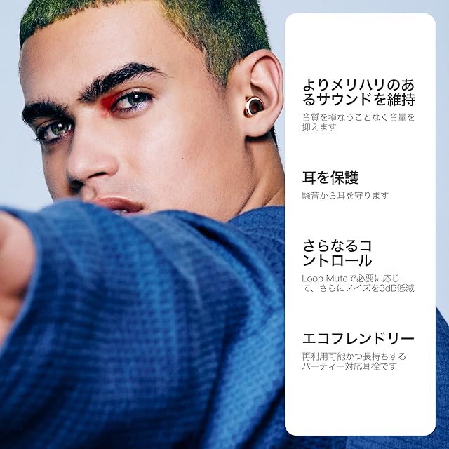 使い方簡単 - 差し込んでひねって固定して、自分のボリュームで出かけましょう。正しく装着すると、Experience 2は正面から見えません。梱包内容:Loop Experience 2 Plus耳栓 x 1セット、Muteアクセサリー x 2組(ブラック・ホワイト各2個)、シリコン製イヤーチップ x 4組(XS/S/M/L)、フォーム製イヤーチップ x 3組(S/M/L)、持ち運び便利なキーホルダー型Carry Case x 1個。