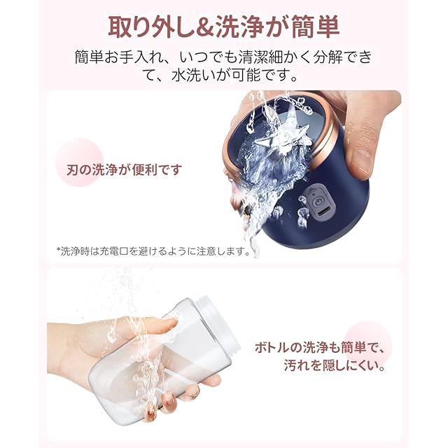 【操作簡単・洗浄便利】ミキサーは簡単なワンタッチボタンで、1回押すだけでわずか45秒でお気に入りの飲み物を作ることができます。部品が細かく分解できるので、刃の周りにハウジングがなければ汚れもたまりにくく、隅々まで掃除しやすいので、掃除がとても簡単で楽です。(※安全上のため、本体を水に浸さないでください。本体を洗うときは、できるだけ充電口を避けてください。)
