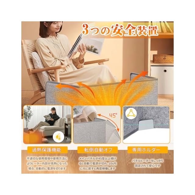 【多重保護、安全安心】:M字型デザインと3つの固定スタンドにより、パネルヒーターはより安定し、転倒しにくいです。子供やペットに押し倒されたら?45度以上傾いたら、すぐに自動的に電源が切れますのでご安心ください。直立に戻ると自動的に運転を開始します。また、内部温度制御技術により、異常な発熱を検知すると、すぐに自動で電源が切れます。パネルヒーターは耐熱素材を使用しているので、保温中に手で触れてもやけどすることがなく、子供やペットのいるご家庭でも安心してお使いいただけます。このパネルヒーターは日本電気安全PSEの認定を受けており、絶対安全を優先する製品です。