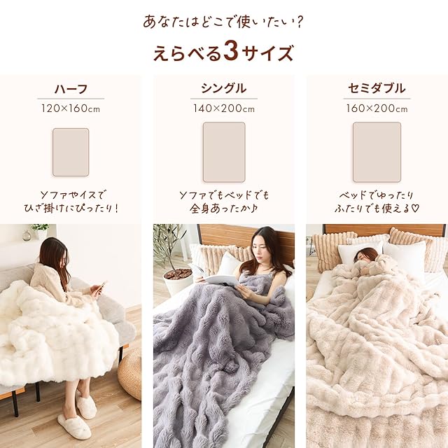 【Rocottoこだわりの二重毛布】 とことん「あたたかさ」にこだわって、まるでネコを撫でているようなとろける肌ざわりの「ふわとろラビットファー」調と、たっぷりボリュームの「もこもこシープボア」を組み合わせました!ミンクファーやフランネルが多い中、シープボアを採用することでもっとあったかい! 【場所や用途に合わせてえらべる3サイズ】 ソファやオフィスなど、ひざ掛けにぴったりな「ハーフサイズ」座ってても、寝転んでも、全身あったかい「シングルサイズ」ベッドでひとりでゆったり!2人でもあったかい「セミダブルサイズ」