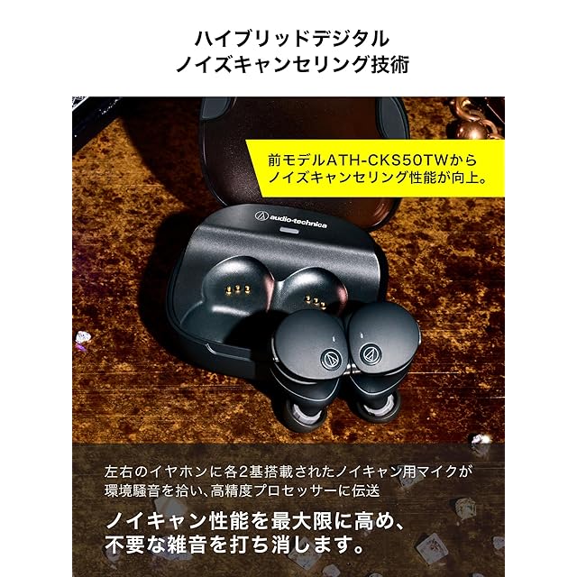 オーディオテクニカ ATH-CKS50TW2 BK(E) ワイヤレスイヤホン Bluetooth 5.3 ノイズキャンセリング 重低音 LE Audio対応 オリジナルステッカー付き マグネティックスイッチ機能 最大約65時間再生 IP55 防水防塵 マルチポイント対応 置き忘れアラート ヒアスルー 低遅延モード 急速充電 Qiワイヤレス充電対応 ブラック