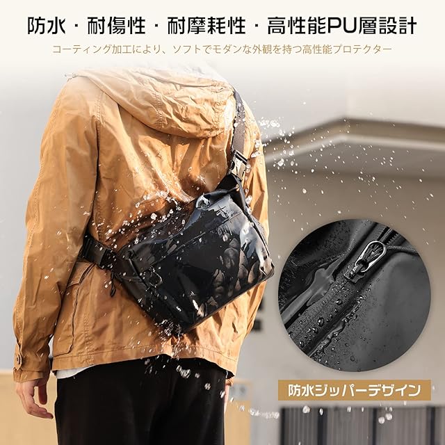 【取り外しな仕切りと耐衝撃性な素材】アップグレード環境配慮型複合素材で製造されて、より防塵と防油できます。内部は耐衝撃性により優れた素材を使っており、また、内部には取り外し可能な仕切りがあり、機器の用途に応じて配置されています。バッグの中身の大事なガジェットをしっかりと保護し、デジタルアクセサリーを損傷から守ることができます。