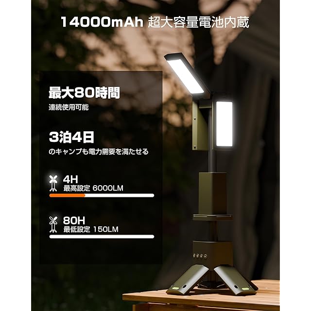 【14000mAh大容量電池内蔵・最長80H連続使用可能】14000mAhの超大容量バッテリーを搭載し、最長で80時間の連続使用が可能です。長時間のアウトドア活動や非常時でもバッテリー切れを心配することなく、安定した明かりを提供します。