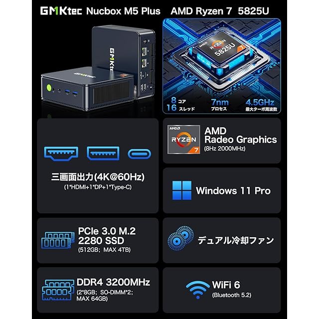 GMKtec mini pc AMD Ryzen 7 5825U (8C/16T 最大 4.50GHz) ミニPC 16GB SSD 512GB Windows 11 Pro 3画面 2.5Gbps LAN WiFi6 Bluetooth5.2