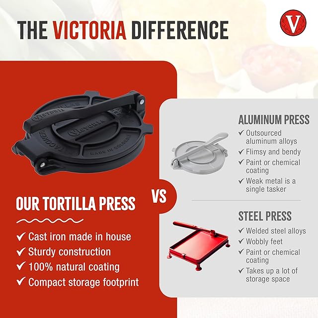 ✅鋳鉄製トルティーヤメーカー:Victoriaの高品質鋳鉄プレス(ケサディーラメーカー)は、非遺伝子組み換え・コーシャ認定の亜麻仁オイルでコーティングされており、PTFEとPFOAフリーのため、健康的なトルティーヤに最適な商品です。VICTORIAの鋳鉄製トルティーヤプレスを使って料理をアップグレードさせましょう!