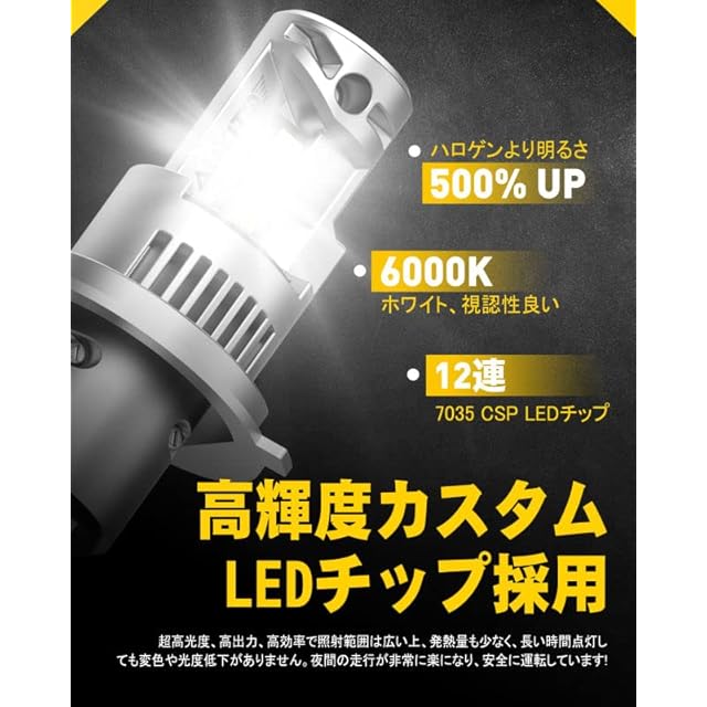 【5倍明るさアップ】AUXITO H4ヘッドライトはカスタム高発光効率LEDチップを採用して、精確な配光によって爆発的な明るさを実現しました。純正電球と交換するだけで明るさが5倍アップ。安定した動きとムラのない拡散性と照射も実現し、ハロゲンより大幅に視認性を高めています。夜間の走行が非常に楽になり、安全に運転しています!省エネは50%。省電力耐久性抜群の逸品です。純正ハロゲンランプのLED化を体験するには最適です!ご注意:元ランプはh4の車のみ適合します。