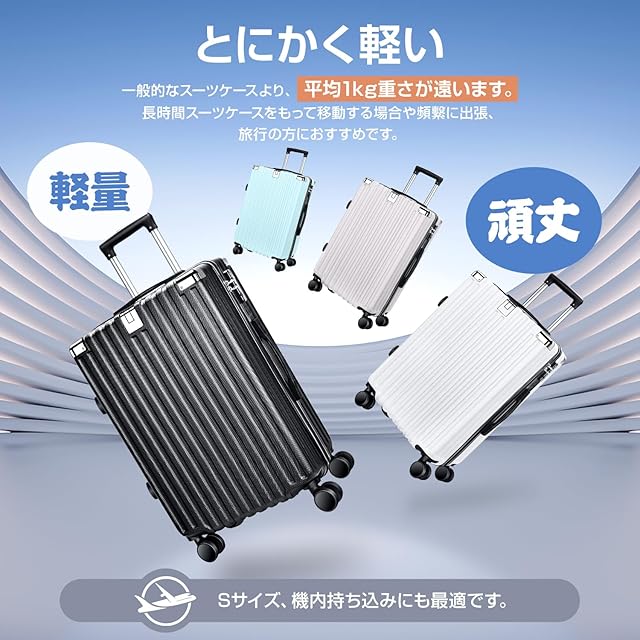 【最新軽量モデル・大容量】落ち着いたカラー、縦縞デザインにより、シンプルかつファッションです。業界高品質スーツケースを目指し、安い値段で抑えられ、何よりコスパ良し!男性だけなく女性の簡単に持ち上げるの軽量なキャリーケースです。さらに、メッシュポケット内蔵され合計4箇所メイン収納があります。大容量なスーツケースは収納便利、旅行や故郷帰りなど最適なスーツケースです。