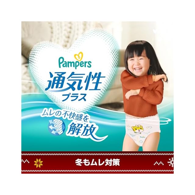 【NEW! パンパース 通気性プラス パンツ】じめじめ解放メッシュで365日赤ちゃんのおしり快適!夏は蒸し暑さで、冬は厚着でおむつのムレが心配。そして長時間履いているとお肌が荒れないか心配…。そんな時は肌ケア設計の通気性プラス パンツ!