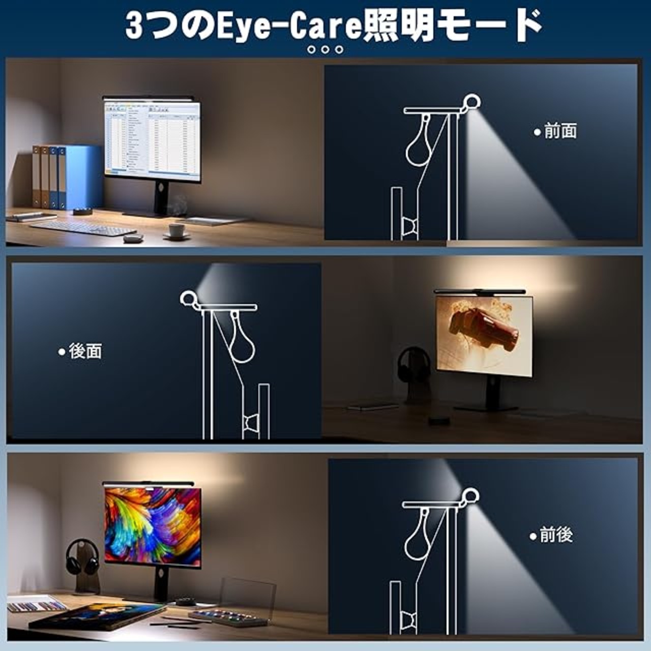 【3つのEye-Careモード】 Quntis USBデスクライトは、背面照明で部屋の明るさやムードを調整し、前後の光源を統合した革新的な照明モードで眩光を最小限に抑える。デスクトップでの作業に集中するためには前面ライト、リラックスしたい場合はバックライト、均一な照明が必要な場合は前後照明モードを選択できる。要するに、このモニター掛け式ライトは、作業中でもリラックス中でも、総合的な目の快適性を向上させることができる。