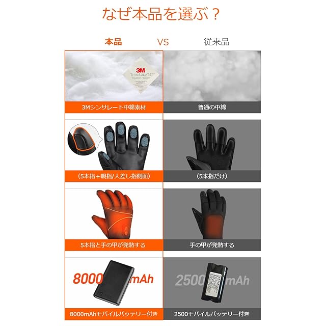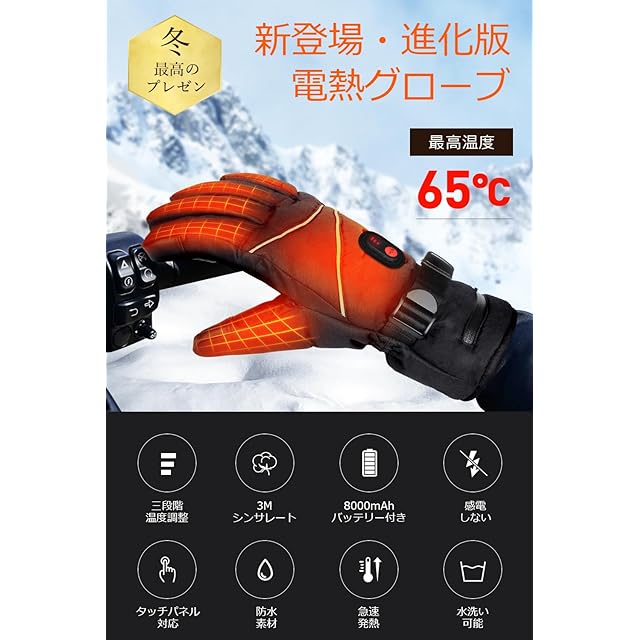 【冬の必需品 & プレゼントにぴったり】冬には、登山やスキー、バイクや自転車、釣りなどのアウトドア活動や通勤・通学・外出時に幅広く電熱グローブが使われています。家族や友人、恋人、または自分用として最適なプレゼントですので、ぜひご利用くださいませ。電熱グローブ本体*1、8000 mahリチウム電池*2、TypeC充電ケーブル*1。