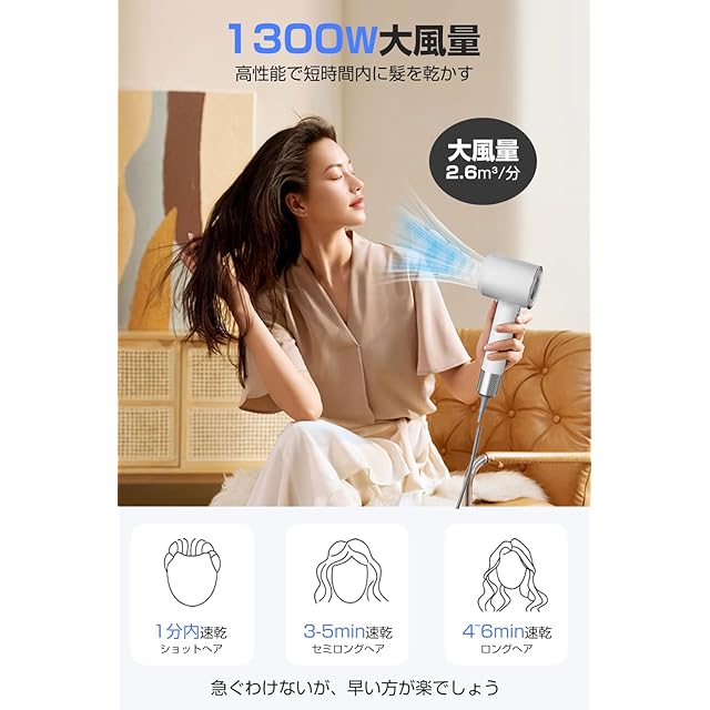 【1300W大風量・本当の速乾】本製品は、純銅製のブラシレス横置きモーターを搭載し、1300Wの大出力を実現しています。これにより、真の意味での大風量による速乾が可能となります。さらに、ヘッド部分には環状風口デザインを採用しており、従来の集中型とは異なり、大面積で風を送ることができます。この設計により、髪へのダメージを大幅に軽減し、同時に広範囲の髪を一度に乾かすことができます。その結果、全体的なスタイリングがより自然な仕上がりになります。朝の通勤前のスタイリングや、洗髪後の乾燥など、どちらも簡単にお使いいただけます。