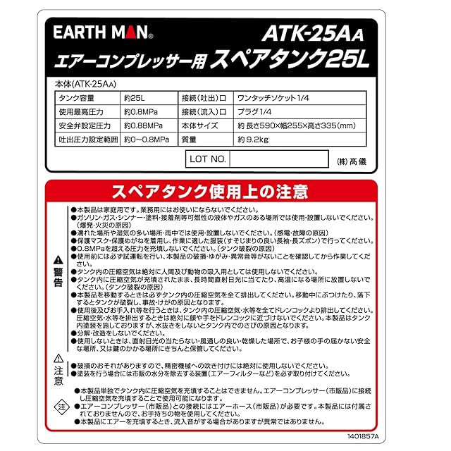 タンク容量:約25L、使用最高圧力:約0.8MPa(約8.2kgf/cm2)、安全弁設定圧力:約0.88MPa(約9.0kgf/cm2)