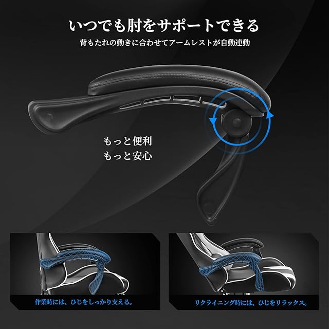 【ひじの安定を守る連動型アームレスト】座った姿勢を整える際、負担をかけない連動型アームレストを設置。複雑な調整が不要で、背もたれの角度によってアームレストが自動的に変わります。
