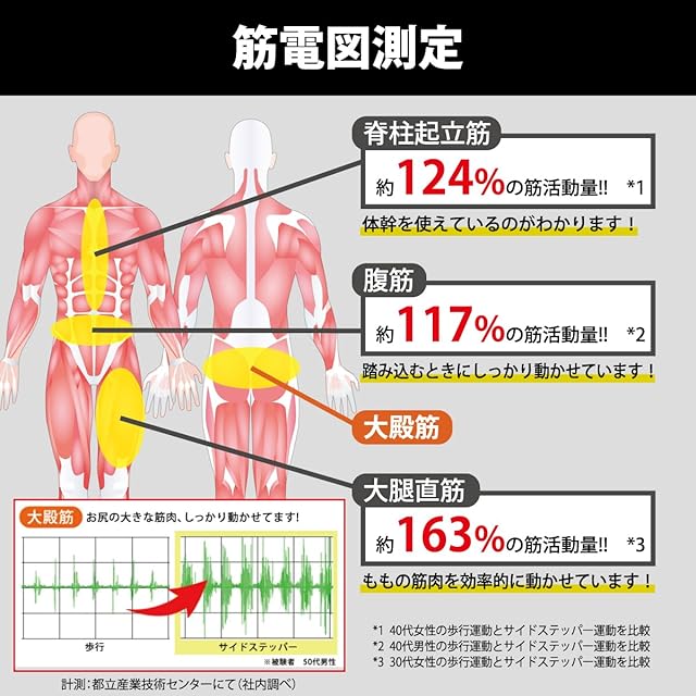 ボディメイク:【体幹トレーニング】サイドステッパーは左右に踏み込むことで、 骨盤周りの筋肉をバランス良く動かすので、無理なく体幹を鍛えていきます。 ・インナーマッスルが鍛えられる・骨盤を整え、美姿勢に 【有酸素運動】有酸素運動とは、酸素を多く取り込みながら行う運動。体内の糖質や脂肪を燃焼することによって、 エネルギーを生み出します。ステッパー運動も有酸素運動です。