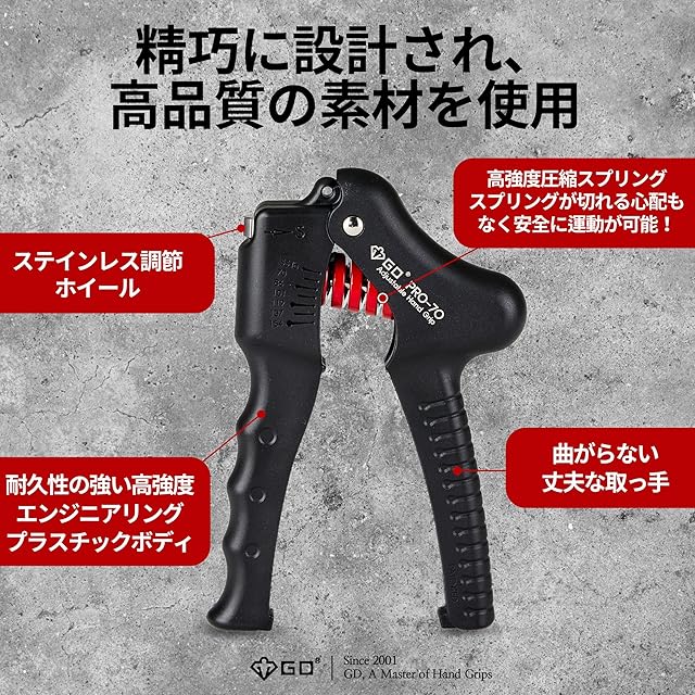 [折れないエンジニアリングプラスチック、究極の堅牢性をお試しください] 高強度エンジニアリングプラスチックや、金型製造機に使われている圧縮スプリングを使用するため頑強かつ耐久性に優れています。中国製のハンドグリップは、ナイロン素材ではなく廉価なプラスチック素材を使用しており、たやすく折れたりたわんだりする可能性があります。GD GRIP PRO-70は最高級ナイロン素材を使用しており、プラスチックでありながら鋼製であるかのような頑丈さです。
