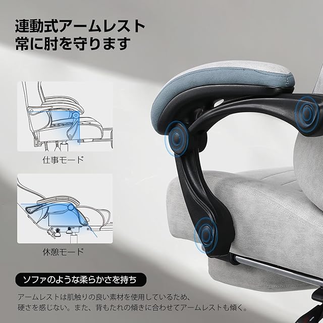 【通気性のよいファブリック】柔らかさと通気性に優れた独自開発のファブリック素材を採用、キルティング技術を入れ、通気性を倍向上した。長時間座っていてもムレがなく快適です。季節を問わず快適な座り心地を維持する。