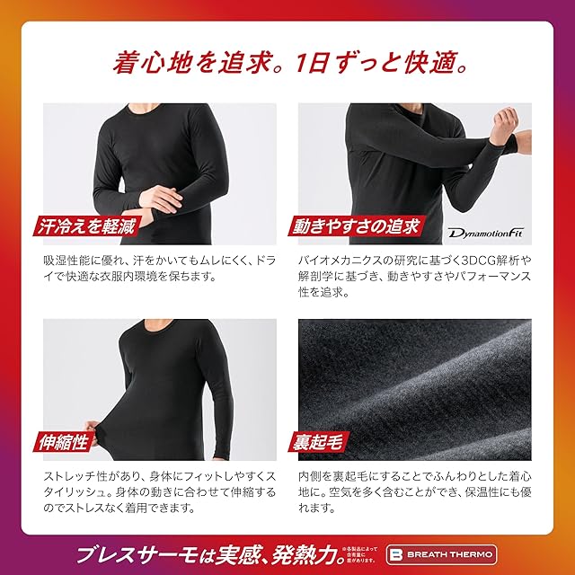 ブレスサーモ最大含有。極寒の中, 止まっていても実感する発熱力。クルーネック, 長袖仕様でしっかり保温。