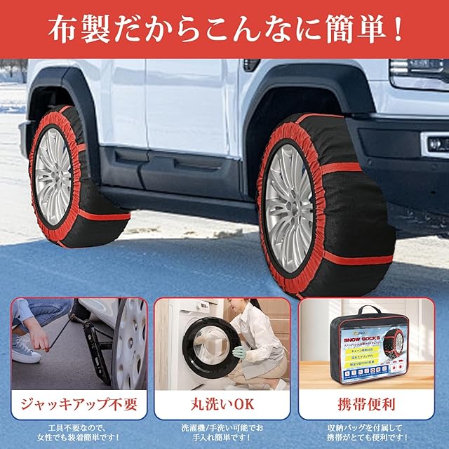 ✨【軽量で取り付け簡単】非金属スノーソックスは非常に軽量で、持ち運びやすさ抜群です。取り付けも簡単で、初心者でも5分で装着可能です。特別な工具やジャッキアップは不要で、いざというときの緊急対応もスムーズに行えます。また、コンパクトに収納できるため、車のトランクにも場所を取らず、常に携帯しておくことができます。