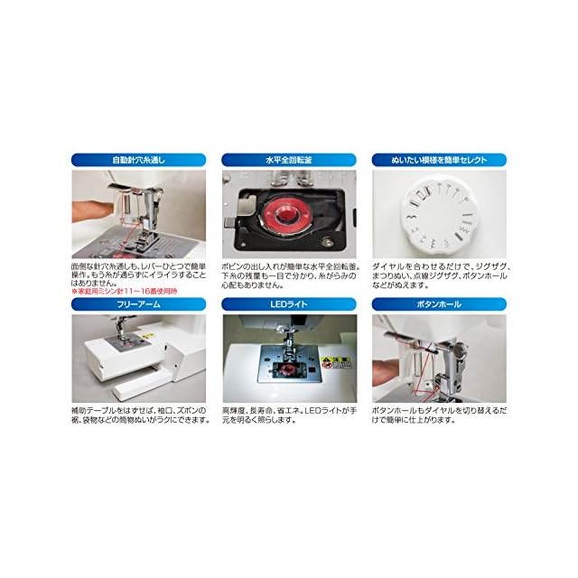付属品:フットコントローラー、ジグザグ押え、ファスナー押え、ボタンホール押え、ボタン付け押え、ドライバー、リッパー/ブラシ、針パック、ボビン、シームガイド、糸こま押え(大小)、補助糸立棒、糸コマ座、使用のてびき、ソフトカバー