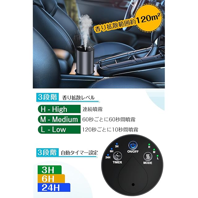 【3段階タイマー調節及び3つ噴霧モード】本機には噴霧モードが3種あります。Hは連続噴霧。Mは60秒ごとに60秒間噴霧。Lは120秒ごとに10秒間噴霧。また、3時間稼働、6時間稼働、連続稼働三つのタイマー機能が搭載されております。