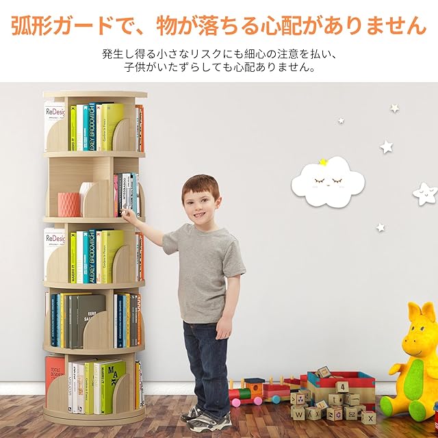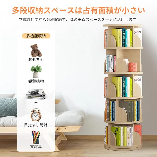 360°回転式本棚:この本棚は360度自由に回転できます。軽く回すだけで、必要な本が簡単に見つかり、混乱を防げます。オープンシェルフはすべての本や展示物を美しくディスプレイするのに最適です。厚みのある木板が高い安定性と耐久性を提供します。各段は木板で仕切られており、分類が簡単で、本の倒れを防ぎます。