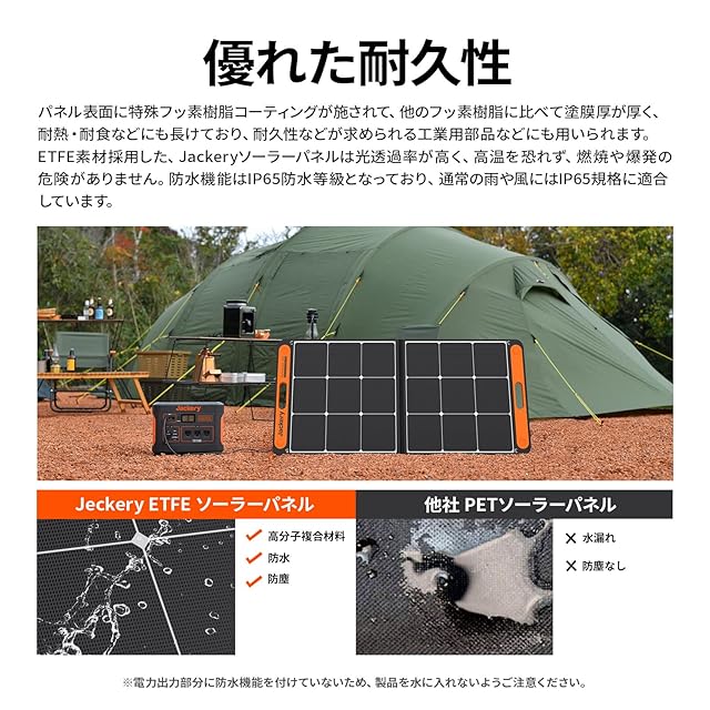【ETFE素材採用】Jackeryソーラーパネルは特殊フッ素樹脂コーティングETFEを採用しております。他のフッ素樹脂に比べて塗膜厚が厚く、耐熱・耐食などにも長けており、耐久性などが求められる工業用部品などにも用いられます。ETFE素材採用したJackeryソーラーパネルは光透過率が高く、信頼できる、高温を恐れず、燃焼や爆発の危険がありません。防水機能はIP65防水等級となっており、通常の雨や風にはIP65規格(電気機械器具の保護等級)に適合していますが、近年のゲリラ豪雨や台風などには完全防水ではありませんので、耐えられません。 ※雨水や風の浸入の影響で故障の原因になります。