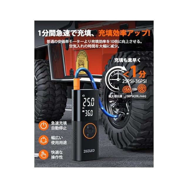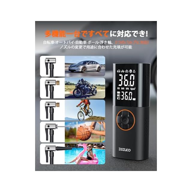 【7800mAh 大容量電池・タイヤ空気圧検知】Zgzuxo空気入れ 電動は大容量の 7800mAh リチウムイオン バッテリーを搭載したこのポンプは、1 回の充電で4 台の車のタイヤを膨らませることができます。✅市場で最大のバッテリー量を採用し、使用時間が2倍に増加した。一度充電して長時間動作可能です。アウトドアやレジャーはもちるん、日常生活に欠かせない。コードレスでタイヤのエアコンプレッサーを手軽に実現、両手を解放されます。これにより、外出中に電源が切れる心配がなくなります。ZGZUXO電動空気入れは精密なタイヤ圧力を測定し、タイヤ圧力の状態を簡単に読み取り、観察することができます。正確な空気圧管理を簡単に行えます。